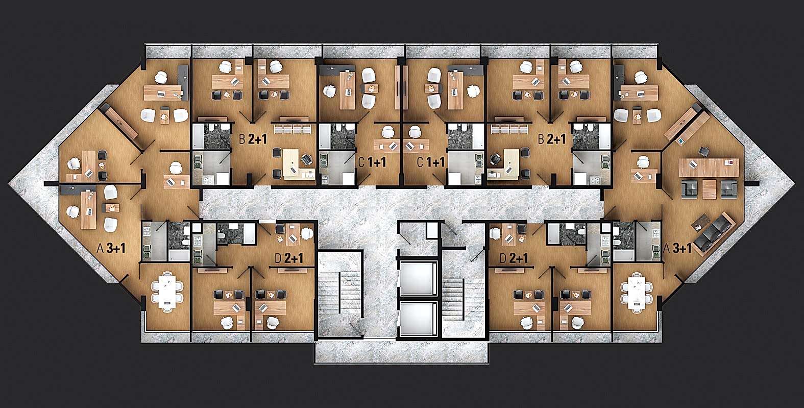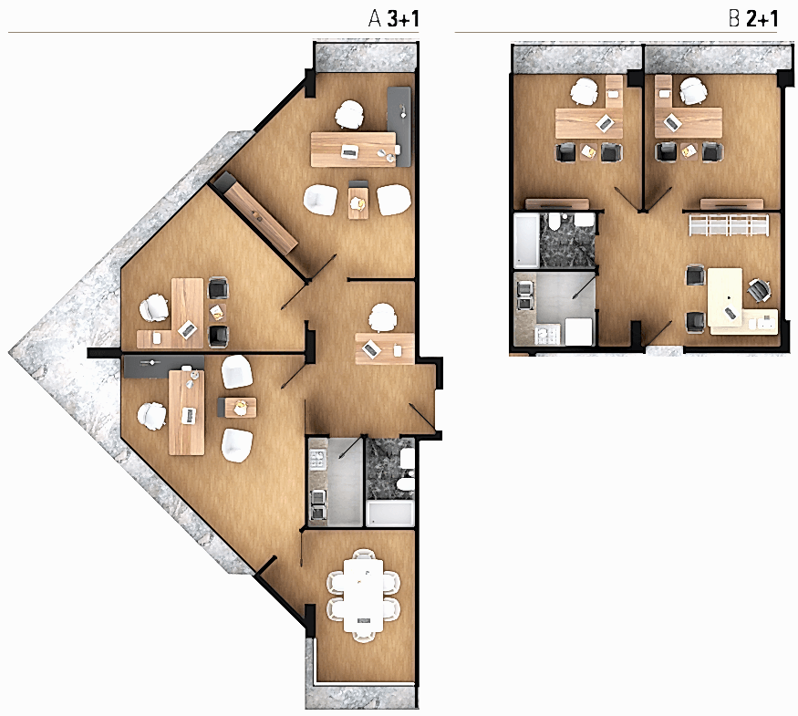 Değer yaratmaya çalışan ve zamanı değerli olan iş sahipleri için tasarlanan Panora Plaza ofisleri 40 m2 ile 540 m2 arasında değişen büyüklüklerde 1+1, 2+1, 3+1 olarak projelendirilmiştir.